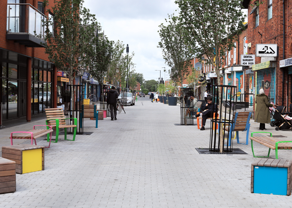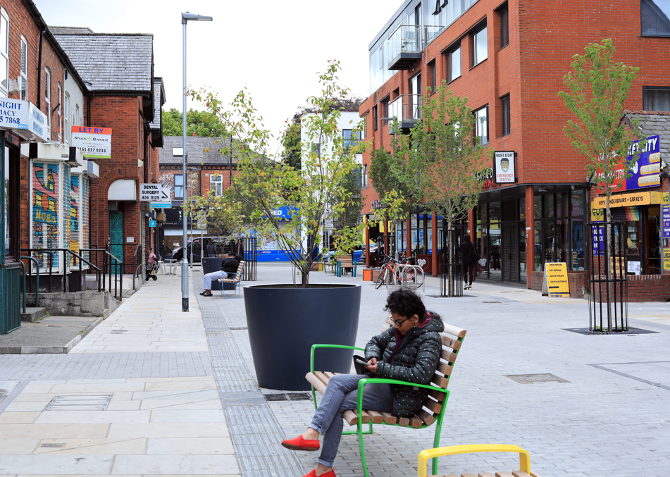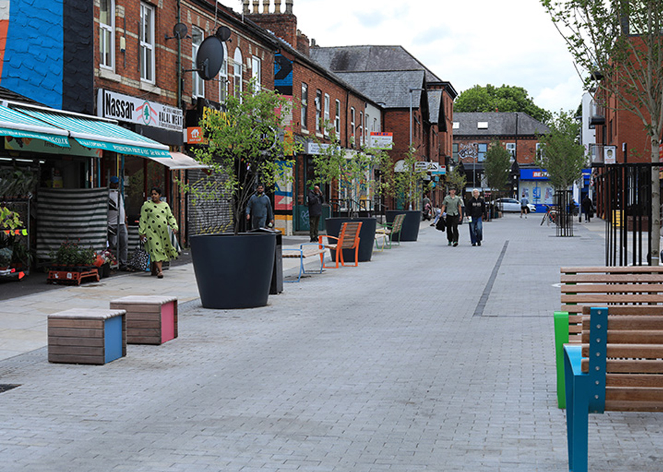 Working in close consultation with Manchester City Council, the general public, local businesses and Withington Village Regeneration Partnership the design was developed to produce a high quality public realm with catalysts for growing community confidence increasing pedestrian footfall and business investment.